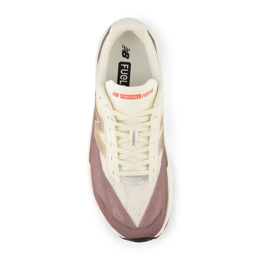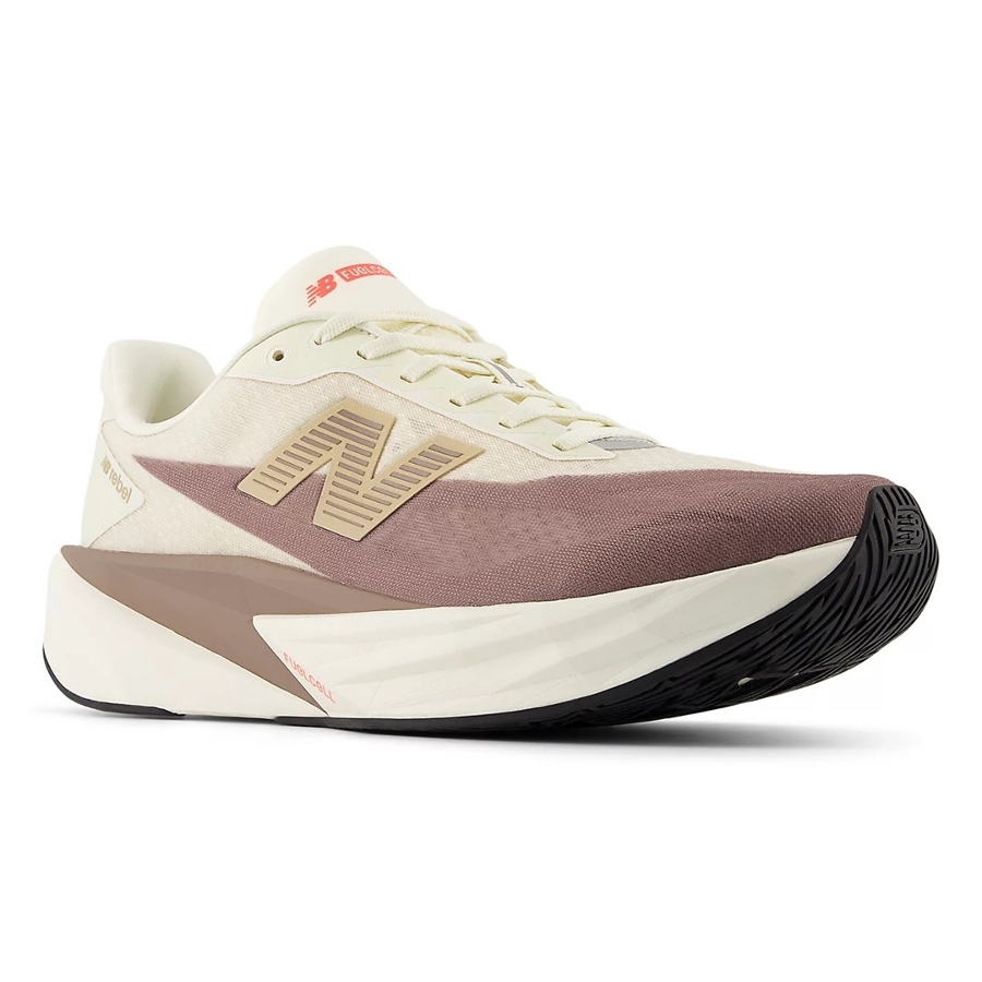 - NEW BALANCE. MFCXLY5. FUELCELL REBEL V5. ANGORA WITH EARTH SHADOW AND SEA SALT. The FuelCell Rebel v5 was built to look and feel fast. With its streamlined, race-inspired mesh upper and colorblocking designs, the resulting silhouette boasts a modern style that inspires, surprises, and confidently stands out ahead of the pack. Incredibly lightweight, its blend of PEBA and EVA foams and considered midsole geometry provide a responsive and energetic underfoot, ideal for those miles you want to feel fast. Equipped with FuelCell midsole technology, this upbeat trainer can easily transition from long, steady runs to something swifter and more spontaneous.