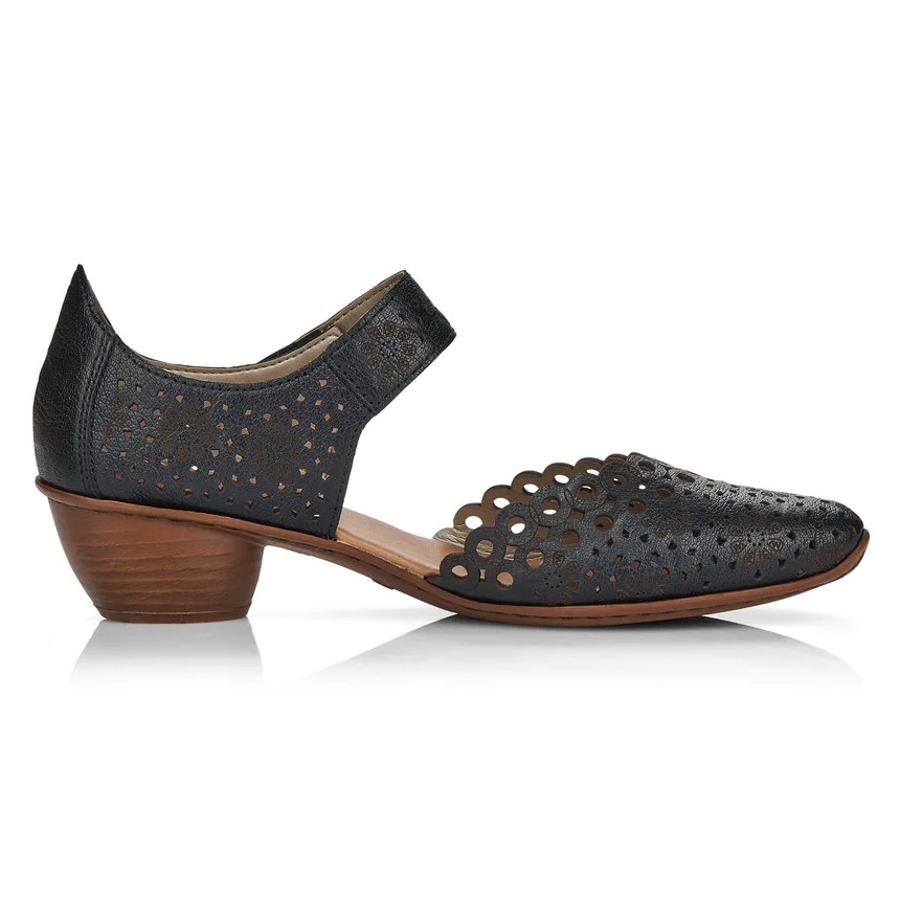 - This daintily practical low-heeled beauty slips on with ease for occasions dressy or casual, with an adjustable ankle strap for a custom fit. Its all-over laser-cut design adds a unique flair to this timeless shoe.