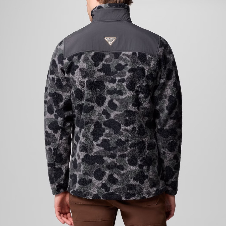 • COLUMBIA. 2137431010. MEN'S PHG SHERPA JACKET. BLACK DELTAHUNTER CAMO SHARK. This plush fleece provides warmth and comfort in light rain and mild conditions while securing your valuables with handy zippered pockets.